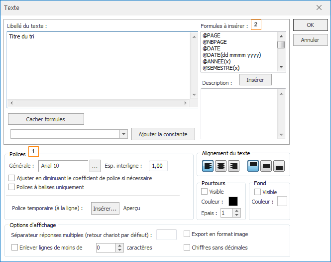 Pour insérer dans la page un tableau ou un graphique préparé dans l’un des tris de la fenêtre TRI, il faut double-cliquer sur un cadre portant l’indication «TRI » pour ouvrir la fenêtre ci-contre.