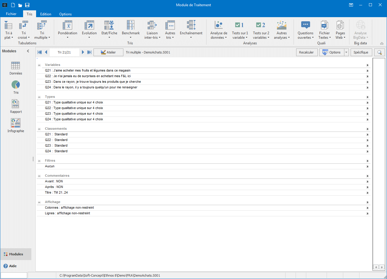Cette fonction appliquée au fichier exemple DemoAchats.S001 donne 20 tris à plat et un tri multiple pour les quatre questions regroupées en tableau. L’écran suivant s’affiche :
